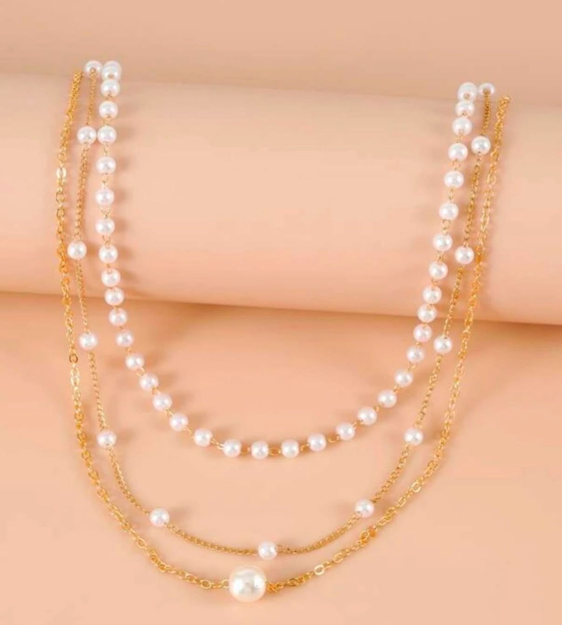 Elevate your style with this stunning layered pearl choker necklace set. Featuring three elegant strands with delicate white pearls and fine gold chains, this piece blends classic charm with modern layering trends. Perfect for weddings, parties, or chic everyday wear, it's lightweight, skin-friendly, and designed to make a statement. Wear all layers together or style separately for a versatile look.