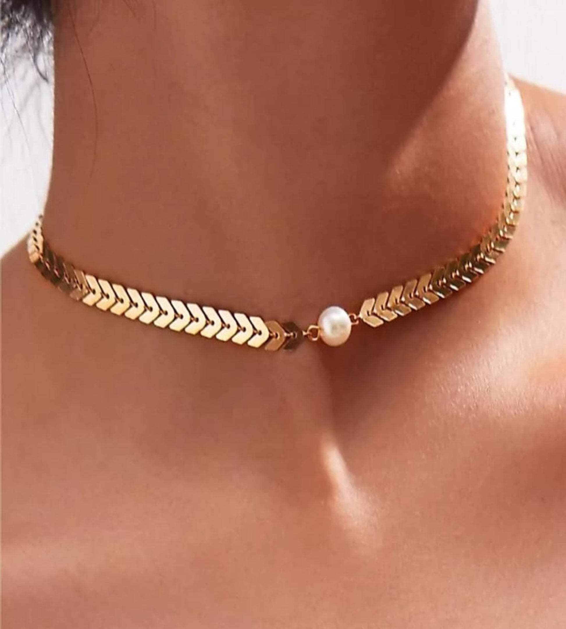 Make a bold yet elegant statement with this gold chevron choker necklace featuring a sleek, arrow-link chain and a single lustrous pearl accent at the center. Designed to sit comfortably around the neck, this modern gold choker blends contemporary style with timeless sophistication. Ideal for parties, special occasions, or elevating everyday outfits, this pearl and gold choker is a must-have addition to any fashion-forward jewelry collection. Crafted for versatility, it’s the perfect gift for birthdays, anniversaries, or to treat yourself.