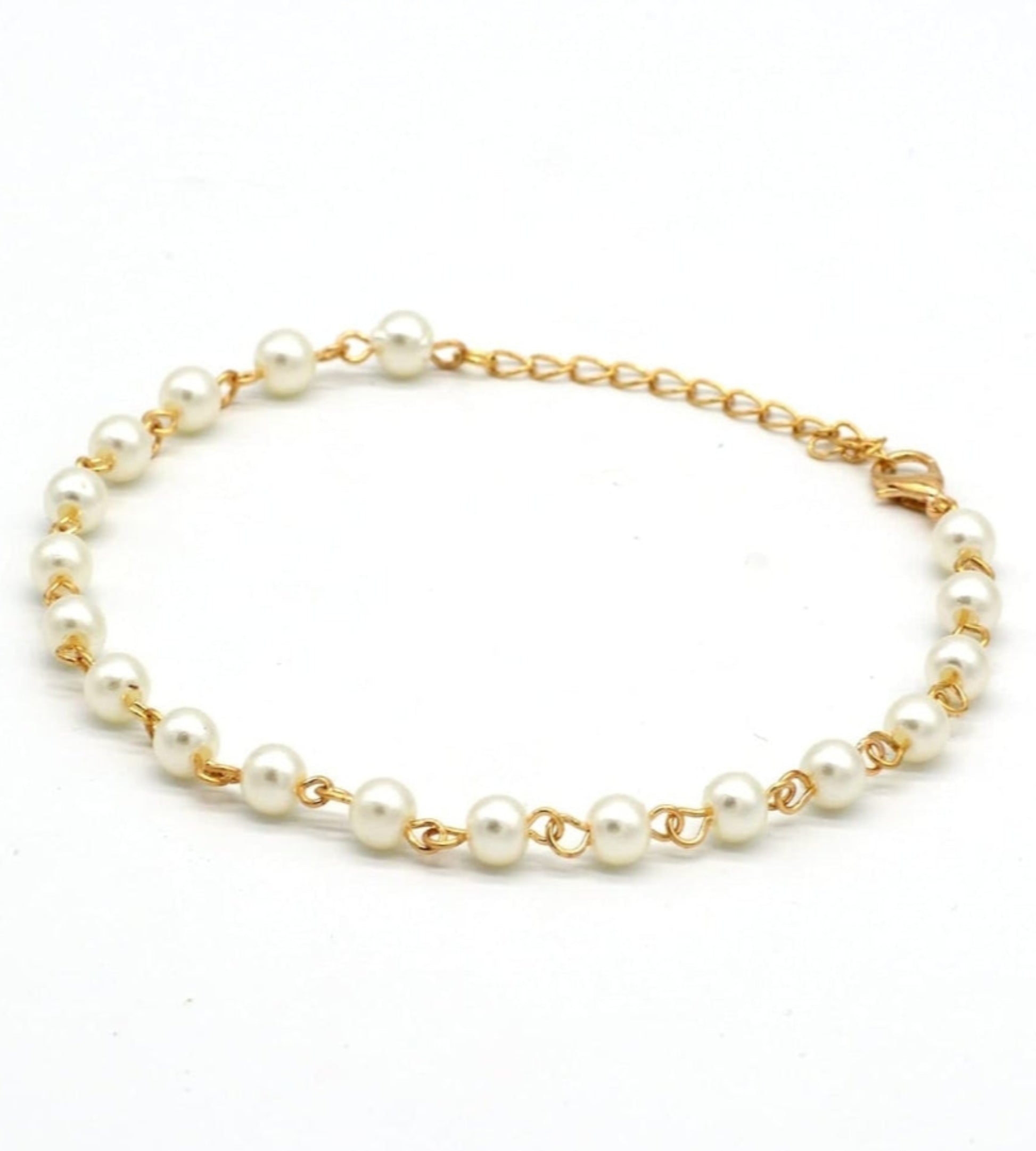 Elevate your accessory game with this elegant gold pearl beaded anklet, a timeless piece that blends simplicity with sophistication. Crafted with lustrous faux pearls, this anklet is designed to add a delicate shimmer to your step. The pearls are evenly spaced for a clean, graceful look that complements both casual and dressy outfits.