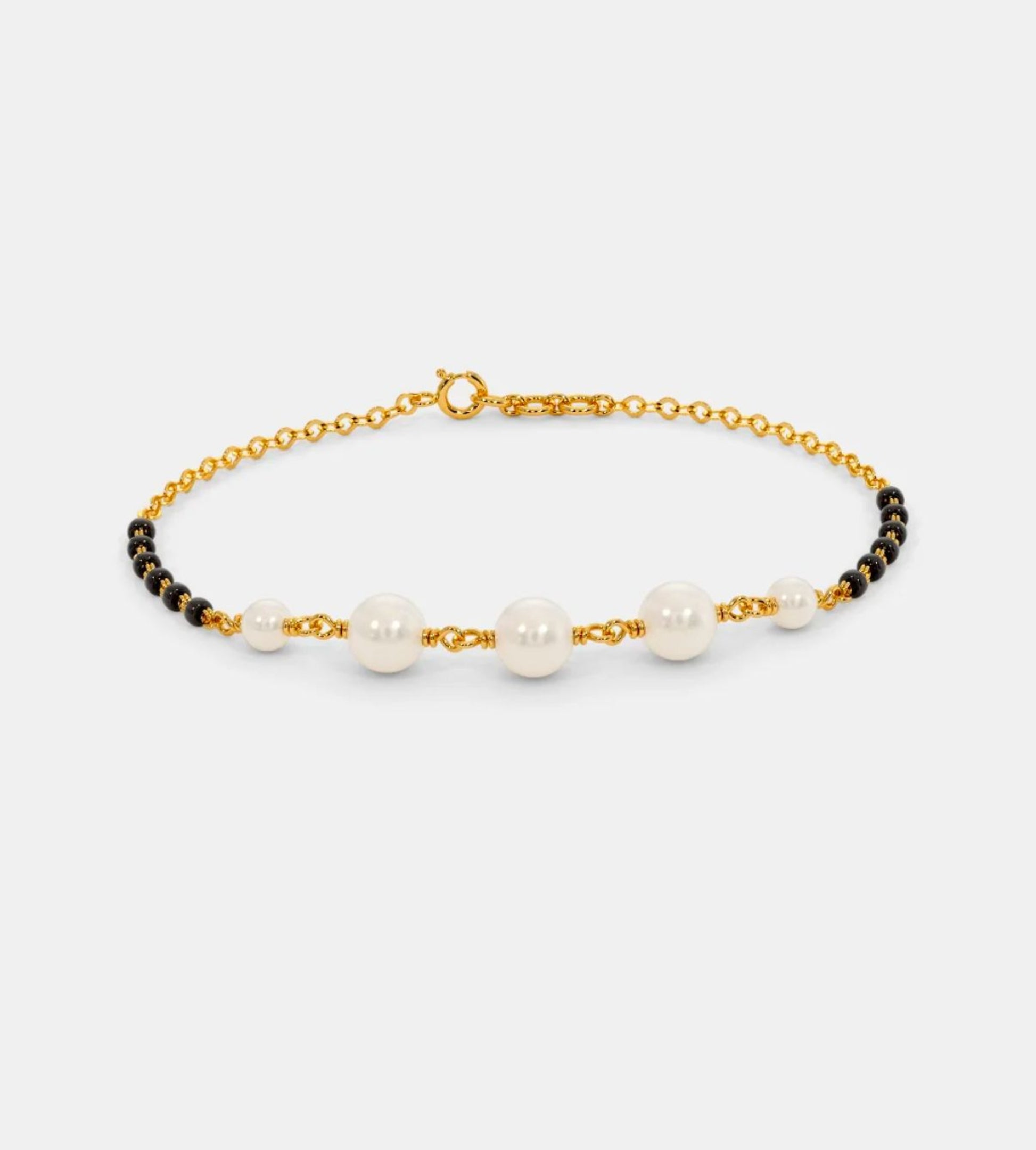 This elegant hand mangalsutra bracelet beautifully blends tradition with modern style. Featuring luminous pearls interspersed with classic black beads on a delicate gold-toned chain, it’s a graceful symbol of love and commitment. Perfect for everyday wear or special occasions, this bracelet adds a touch of sophistication to your look while honoring cultural heritage. Lightweight, stylish, and timeless.