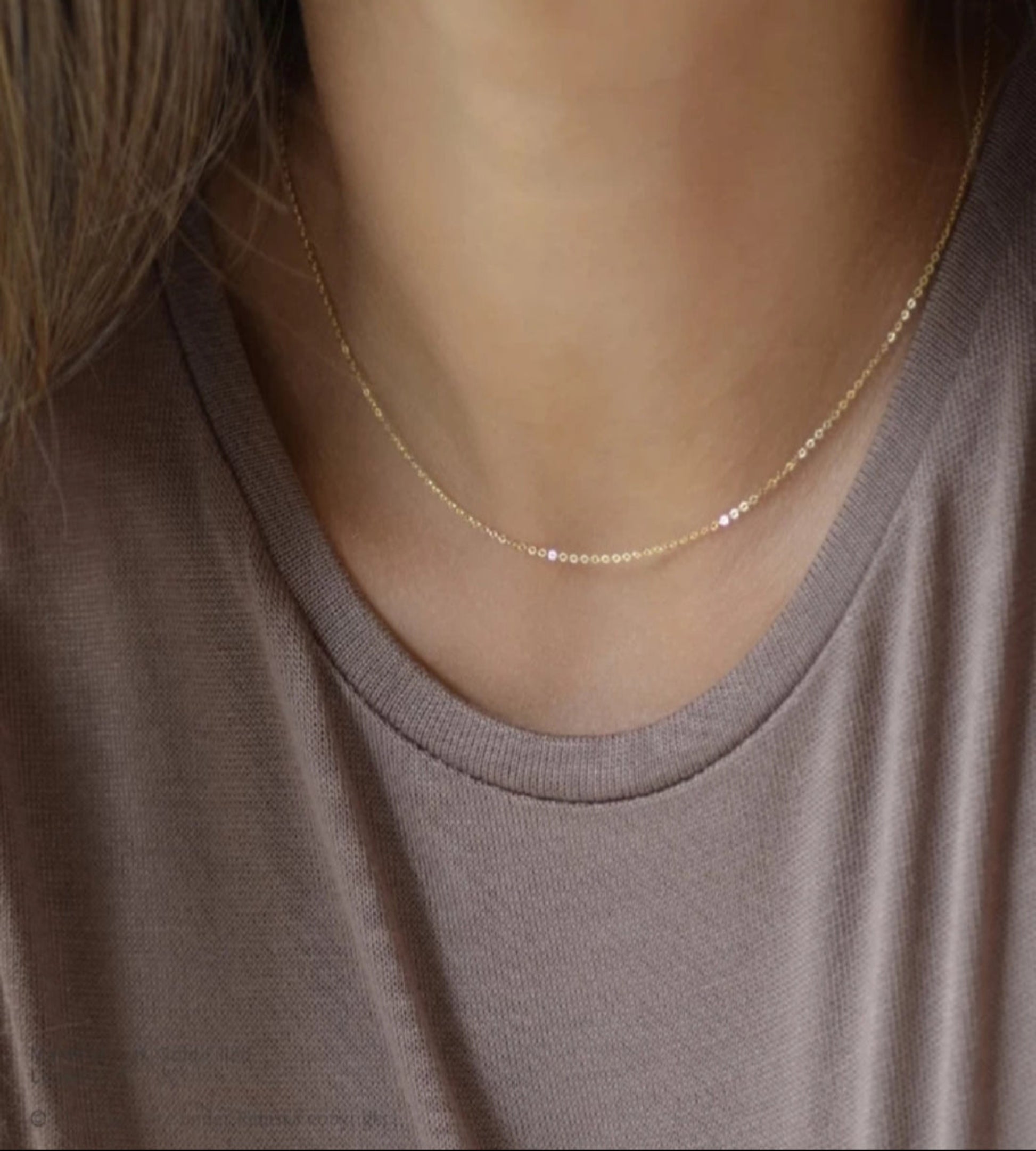 Elevate your everyday style with this ultra-fine gold plated disc chain necklace. Featuring tiny reflective discs linked along a delicate gold chain, this minimalist necklace catches the light with every movement, offering a subtle sparkle that's both modern and timeless. Perfect for layering or wearing alone, this lightweight piece adds effortless elegance to any outfit.