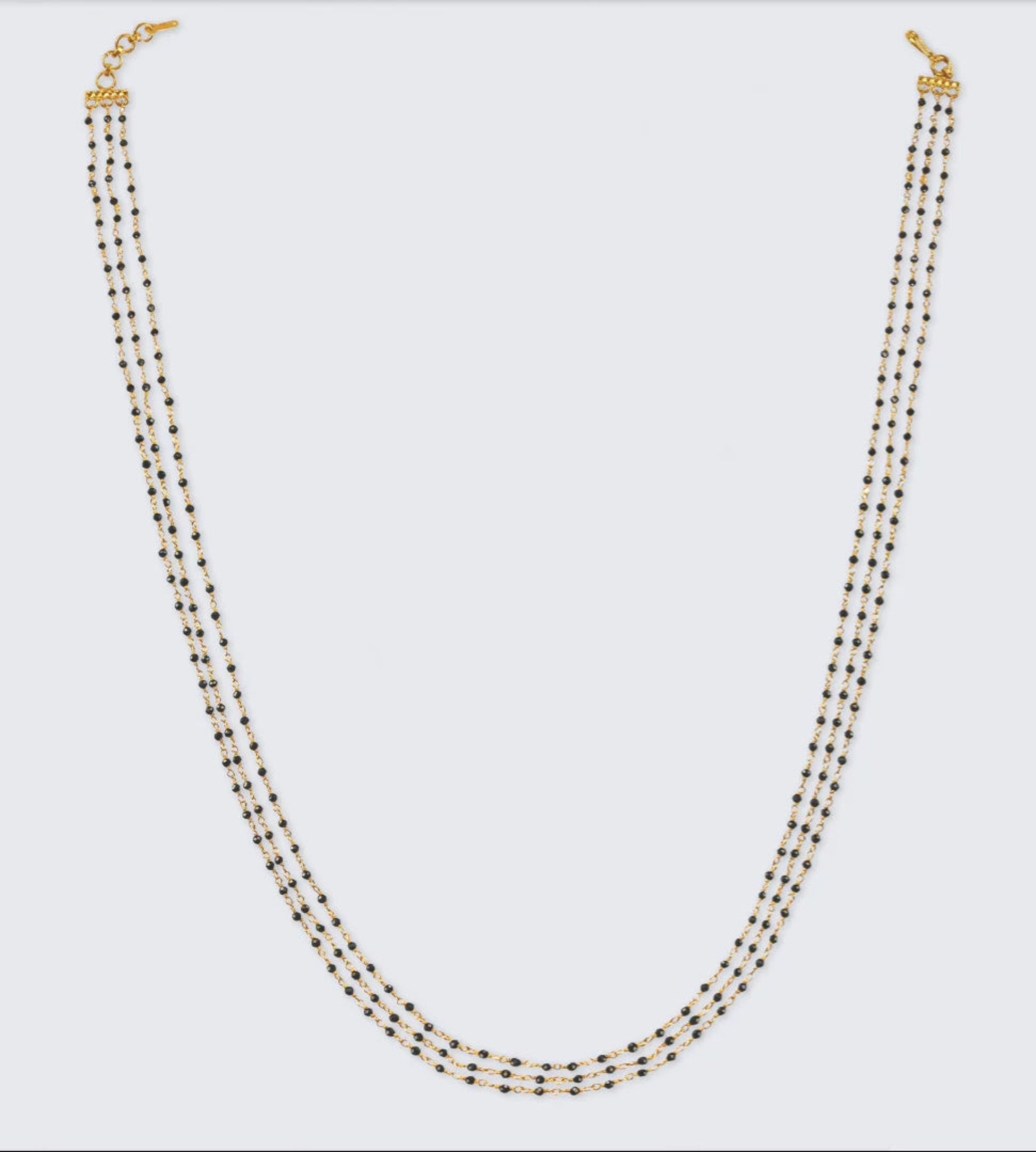 Celebrate timeless tradition with a modern twist through this elegant multi layer necklace. Crafted with precision, it features three graceful strands of alternating black crystal beads and gold-tone elements, symbolizing love and commitment in Indian culture. The layered design adds depth and sophistication, making it an ideal piece for both everyday wear and special occasions. Style it with ethnic or contemporary attire to honor tradition with grace and beauty.